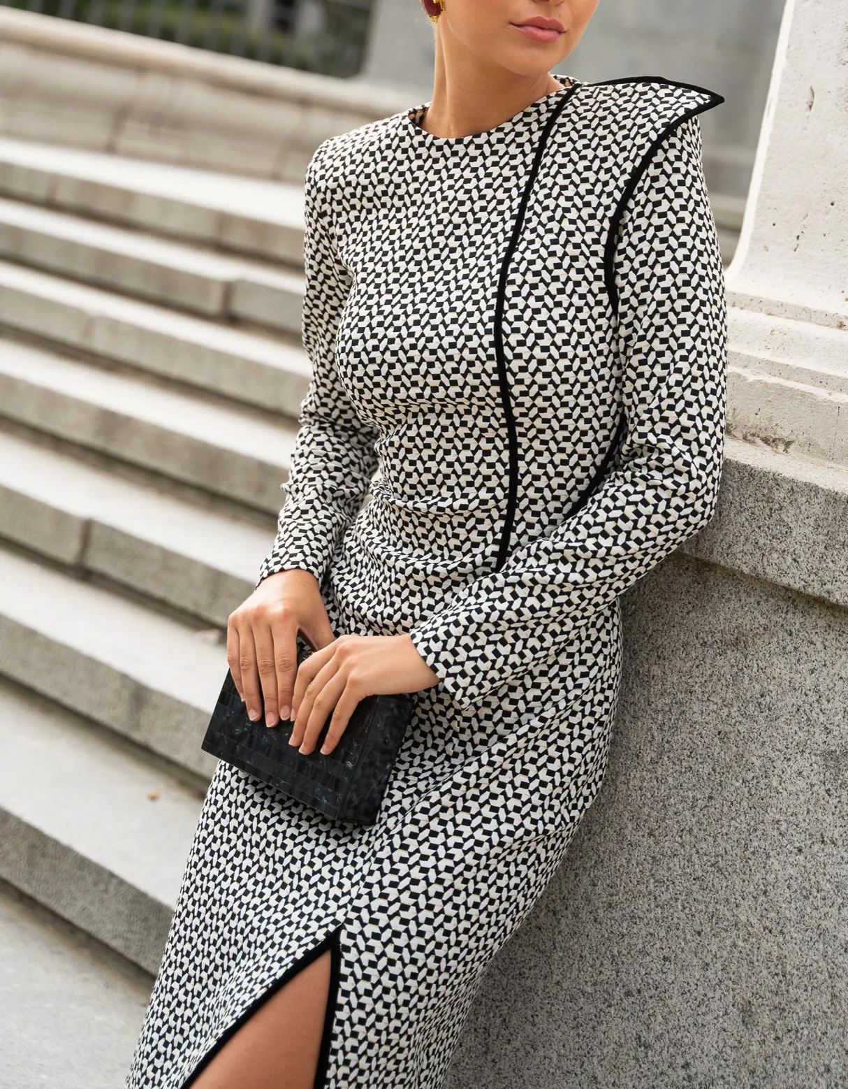 Vestido midi con espectacular tejido en jacquard geométrico y sutil lurex. Líneas marcadas con ribetes de terciopelo negro que aportan originalidad a este diseño elegante y sencillo.